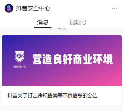 日消息,抖音安全中心今日发布了《抖音关于打击违规售卖等不良信息的公告》,抖音一直严厉打击任何形式的虚假夸大宣传、违规售卖等行为。一经发现,将会从视频、帐号等多维度进行处置。
