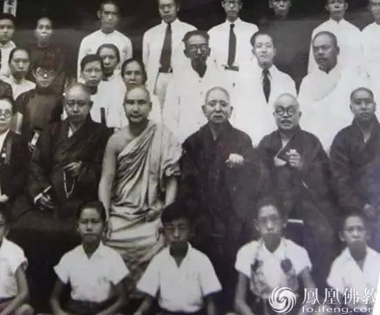 1914年,太虚写了几篇关于关中普陀山的论文,如《佛教概论》、《僧伽制度整理论》、《第一部《楞严经》论等。29岁出关后,戴元英参加台湾佛法协会,前往日本,在上海成立了厥社,编辑了厥社丛书,第二年改为《海潮音月刊》。图为太虚与众智者合影。(图片来源:凤凰佛教𞓜 摄影:武汉市佛教协会提供)